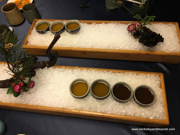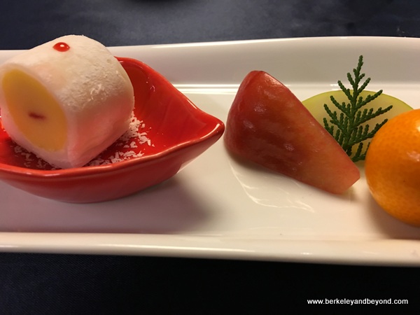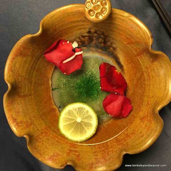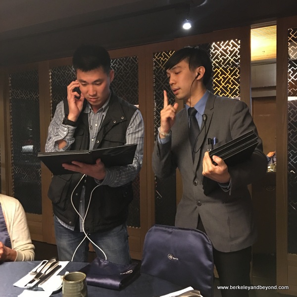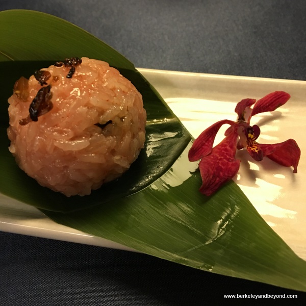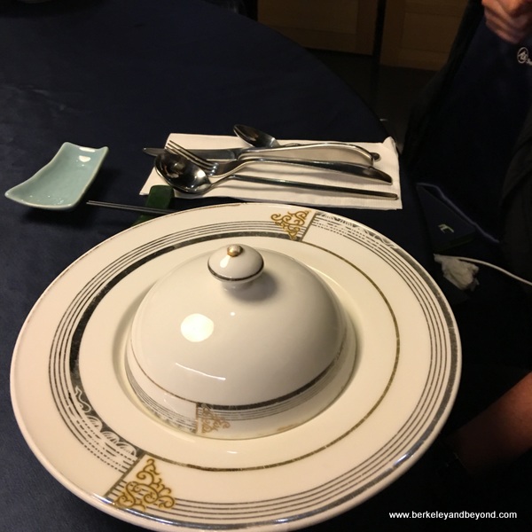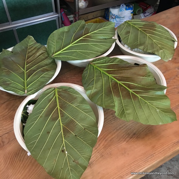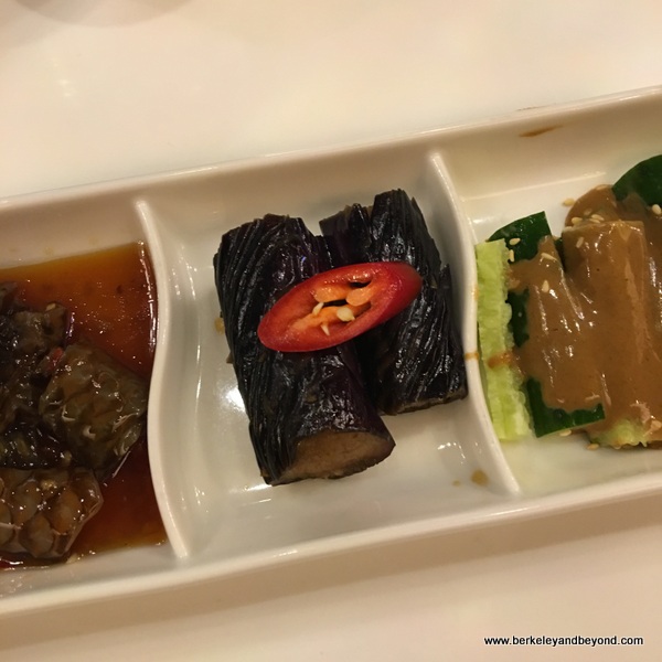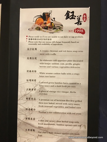 Yu Shan Ge 1F, No. 14, Beiping E Rd, 02-2394-5155. Beautifully appointed and decorated, this upscale restaurant aims for perfection in serving an accomplished and lovely vegetarian Kaiseki Cuisine. Dairy and egg products can be eliminated upon request. Black satin tablecloths and matching bibs are provided, probably because the well-to-do people who come here want to protect their expensive clothes. Presentations are stellar, with some items being enhanced by flowers, plants, or burl-wood platters.