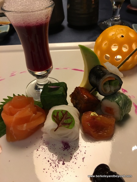 2-elaborate cold appetizer plate decorated with konjac sashimi, yam, perilla, gingko berries, and various vegetable delicacies