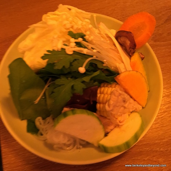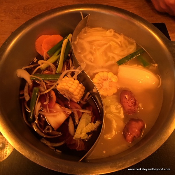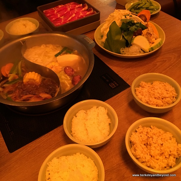 Mo Mo Paradise The Taiwanese love hotpot cooking, and Taipei is hotpot central. In fact there are several hundred of these restaurants in town. It is popular even on hot days, when cooling shave ice becomes a favorite dessert. This type of shared-pot cooking came to China as early as the 600s A.D., and became established in the 1300s. Japan has its version--shabu-shabu, which is different in that each person gets his or her own pot and usually a kelp stock. A special price is offered here for all you can eat in 90 minutes. It turns out I can eat quite a bit! Do-it-yourself cooking occurs right at the table in divided pots that each have two kinds of stock; spicy miso and tomato-vegetable are among the choices. It is lots of fun and includes thinly sliced meats as well as plenty of fluffy vegetables. Drinks include spiked fruit sours (the lemon-grapefruit was delish) as well as beer and sake. Desserts too—panna cotta, Mo-Mo pudding (which looks like flan), and a rich chocolate parfait sundae.