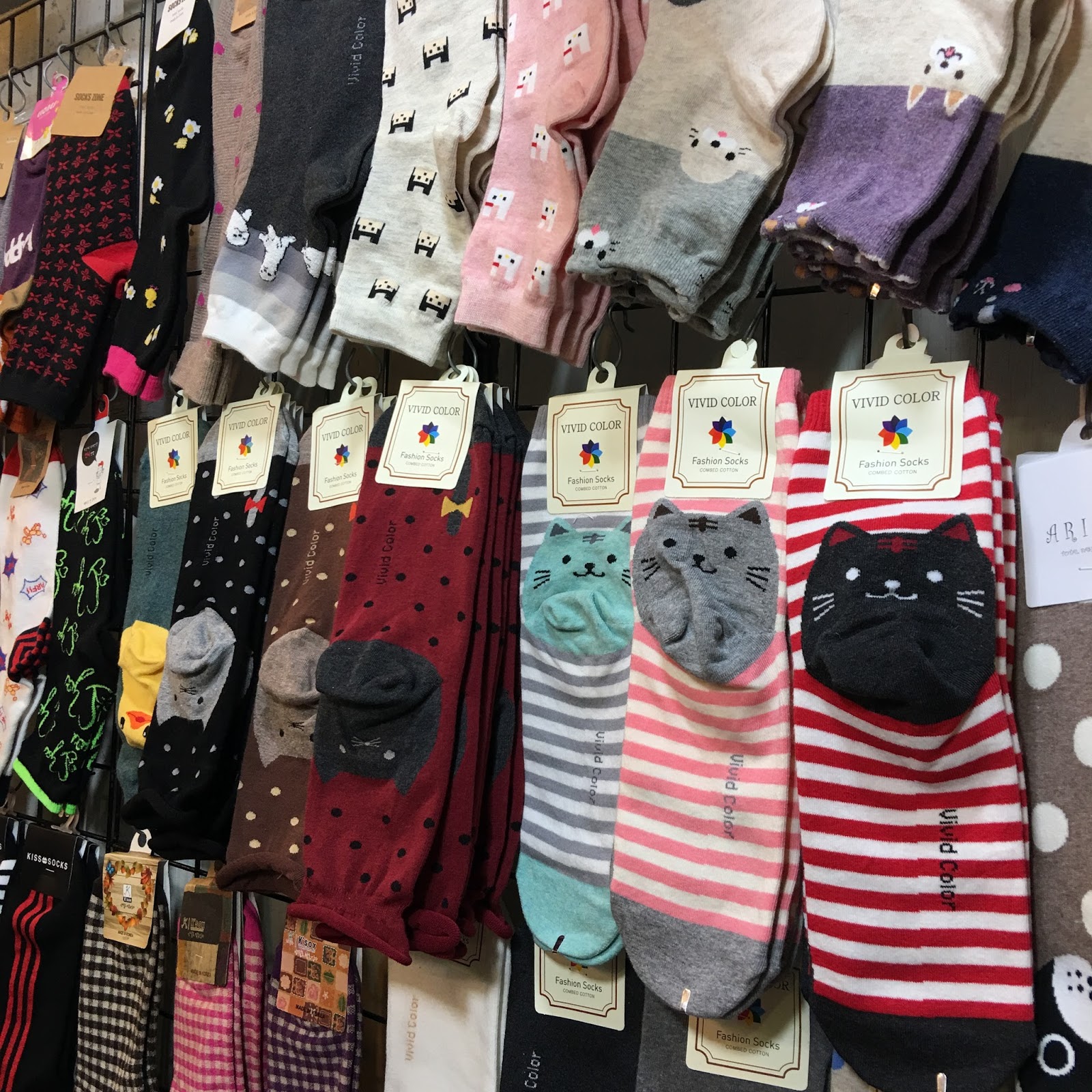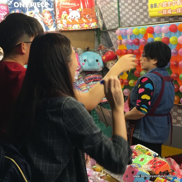 Shilin Night Market Located just outside the MRT JianTan Station. A triangular section of wide pedestrian lanes makes this an easy market to maneuver. It is the most popular night market in town. The story is that items get cheaper the farther away you get from the entrance, so take time to look before you buy. The don’t-miss item here is fermented stinky tofu, which you will recognize easily when you smell it. I think it looks as bad as it smells. The one person in our group brave enough to put it in her mouth did not like it, and the rest of us stayed far away from her. More fragrant and inexpensive Taiwanese snacks include oyster omelets, fried rice noodles, tempura, spring rolls, rice tube pudding, and Tainan Danzai noodles. The big souvenir hit with our group was cute cat socks from Korea. A new Market Building has a basement food hall.