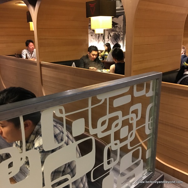 This dumpling shop is part of a food court on the lower level of an indoor shopping center.
