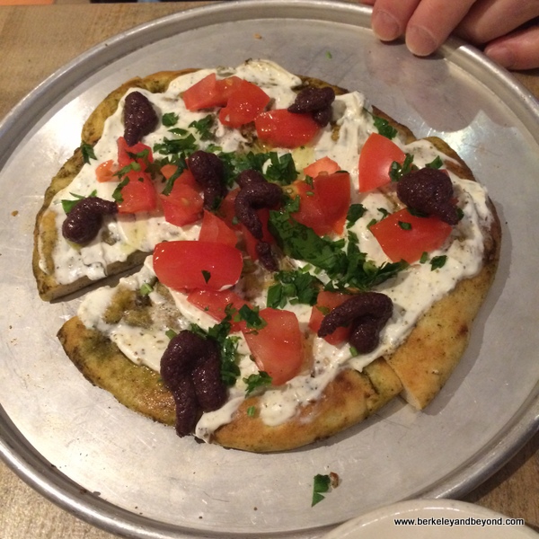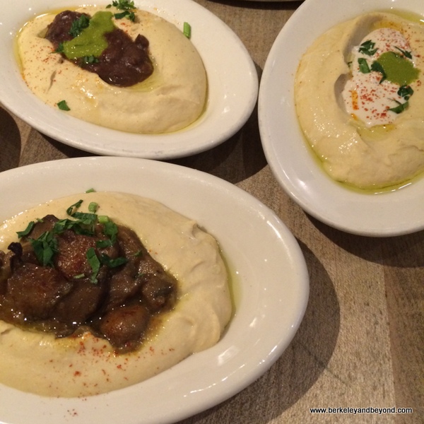 Several different kinds of hummus are on the menu—if you are indecisive you can order a sampling of them—but Masabacha, made with whole chick peas remains my favorite. Fava Hummus, made with fava beans and topped with a hard-boiled egg is probably the most unusual. All are served with really good plump housemade pitas.