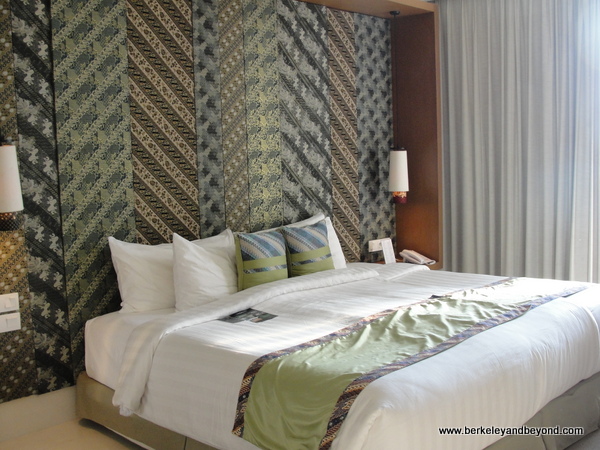 Vasanti Seminyak Resort Bali Jl Petitenget Gg Cendrawasih No. 99 DS, North Kuta, Badung, Bali 80361, +62 361 8466 966. 121 rooms; 4 stories. Pool; fitness room; full-service spa. Breakfast buffet included; restaurant; 2 bars. Free shuttle service via open-air buggy to shopping, restaurants, and clubs in nearby Seminyak area, as well as to Batu Belig Beach and beach club. Newly built in 2012 and located just 45 minutes from the airport and a few minutes from shopping and restaurants, this clean-lined, contemporary hotel features a Balinese style. It sits in a quiet neighborhood amid what formerly was a rice field, and the remaining field around the exterior is still farmed--giving the hotel a pleasant rural feel. Guests often return to the spacious open-air lobby with a musician playing traditional music from Bali or Borneo, and a gaggle of bellboys are anxious to assist and eager to speak in English. An expansive breakfast buffet with particularly tasty pastries, fruit, and local noodles is complimentary to all guests and served in the open-air Devali Restaurant, which also serves lunch and dinner. Beautiful intricately-woven silk panels line the guest room wall acting as a headboard, and comfortable king-size beds are made up with two light duvets (one for each side) and white cotton linens. Marble-tiled bathrooms have a glassed-in shower separate from the bathtub and feature a large glass window with a view into the bedroom and beyond to the view outside; a pull-down shade permits privacy. All rooms have a balcony.