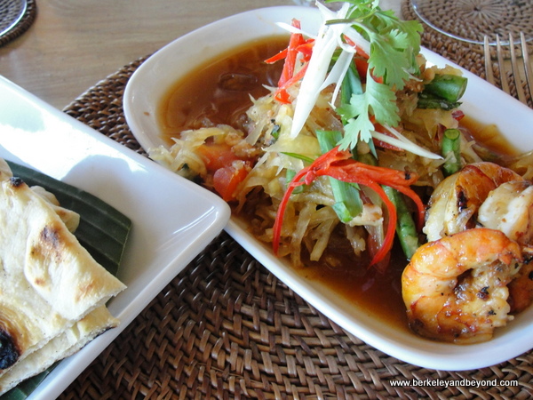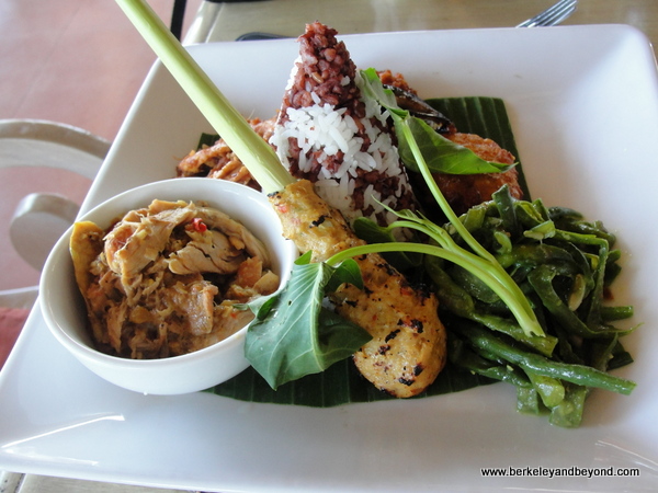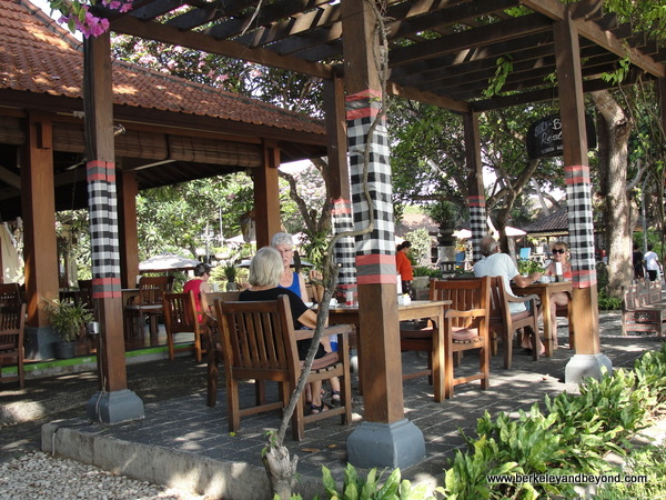 Indus Jin. Raya Sanggingan, Ubud. The owner of this atmospheric spot inside an vintage building, Ketut Suardana, is a story in himself. So is his wife, Janet DeNeefe, who is a noted expert on Balinese cuisine and hosts the town’s annual food festival. Together they own three top restaurants in Ubud plus a guesthouse. The couple also sponsors an annual writers conference. This restaurant’s open-air dining room overlooks a vast jungle area and is both nicely decorated and comfortable. My Asian-fusion lunch here included some crispy appetizer chips and a delicious shrimp curry. It was among the best cuisine I enjoyed in Bali. And I must mention that the restrooms, located downstairs and with a view into the garden, are surprisingly special and a don’t-miss (scroll down).