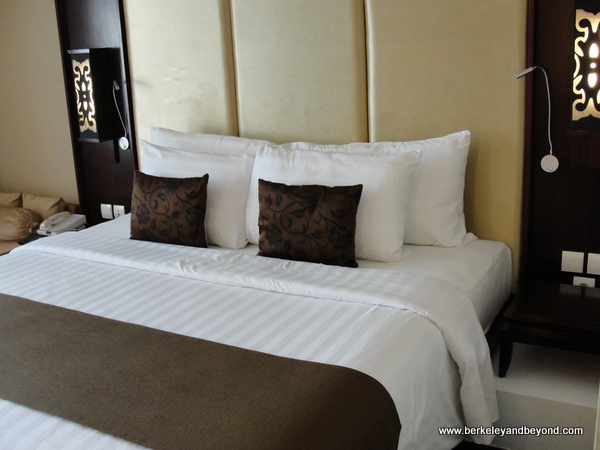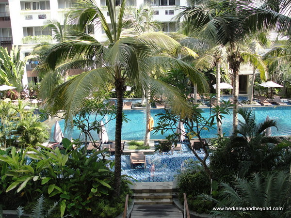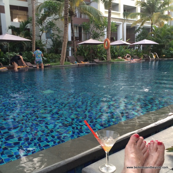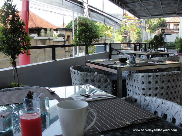 Bathrooms have a Toto toilet with all the bells and whistles. Shower and toilet stalls are separated by opaque glass, and the counter is extra-large. All rooms have a balcony, and the A.C. is gentle, quiet, and efficient. Breakfast in the morning is in an open-air restaurant by the pool. I favored an area in the back that fronts a quiet residential road, and I adored the French toast with papaya jam.