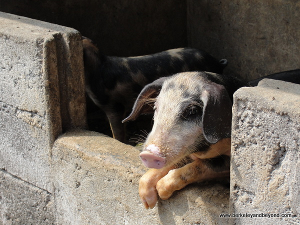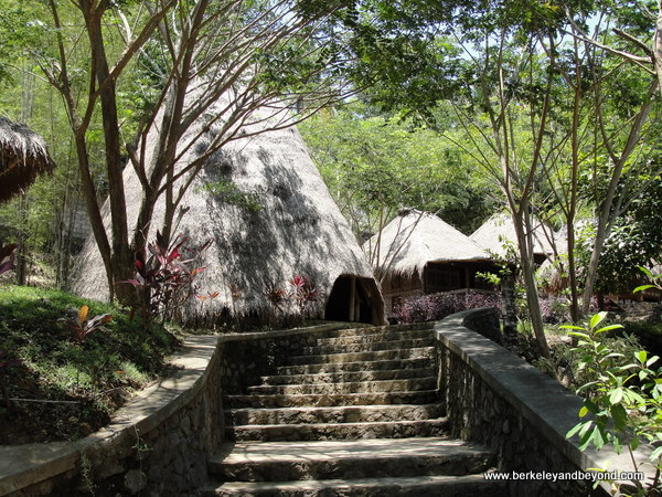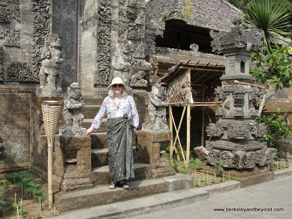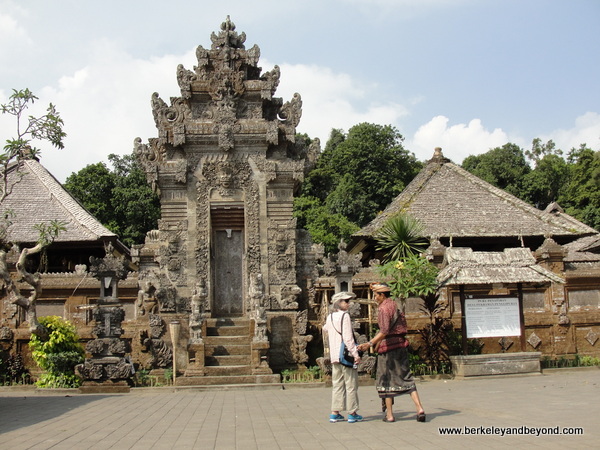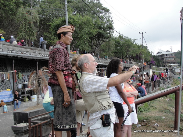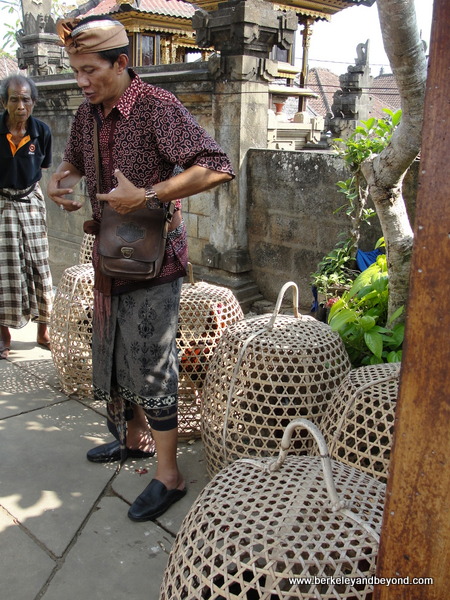 Penglipuran Village The families in this traditional village open their houses to visitors every day in exchange for government payment. It is a great chance for visitors to step through gates and get inside fences to see how local people really live. We visited a very simple household that raised pigs and chickens in their back yard and had an assortment of fruit trees in their garden. Another compound kept a cadre of roosters for fighting that were sadly restrained in cramped bamboo cages that were only a little bigger than they were. Construction in this area uses a lot of bamboo because the wood is produced in great quantity here. A large temple complex is just uphill from the houses. Sarongs are available to borrow for a small donation before entering.