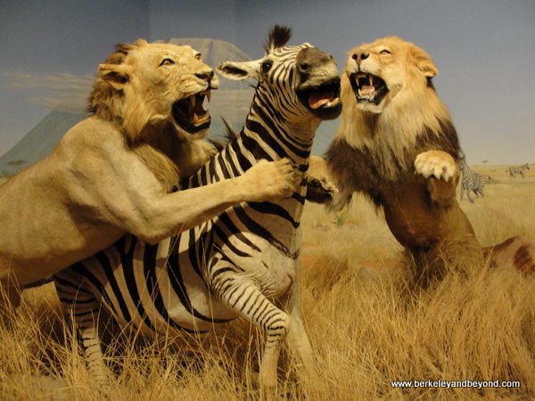 The African galleries depict Early Man and feature a model of Australopithecus which walked upright and was known as Lucy, and an African Savanna exhibit with more taxidermy animals--some centered around a watering hole and others in a depiction of lions attacking a zebra.