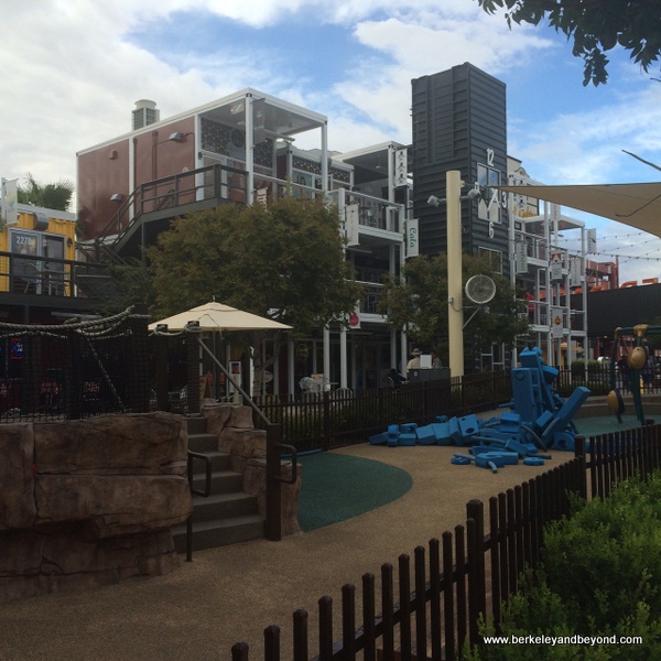 Downtown Container Park 707 Fremont St./7th St., Downtown Las Vegas. No pets. Built from re-purposed shipping containers as well as locally manufactured modular metal cubes, this small open-air shopping center opened in 2013. A giant fire-breathing praying mantis by its entrance lets you know you are in the right place. The center is home to boutiques, art galleries, restaurants, and offices, and a barbershop operates within a retired boxcar and caboose. In the park’s center, a children’s play area features a giant treehouse, where adults can join their kids exploring a 33-foot-tall slide, a NEOS play system, and over-sized foam building blocks.