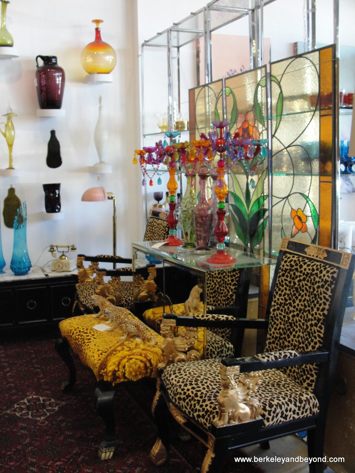 Patina 1300 S. Main St., (702) 776-6222. Across the street and down a block, past the Casa Don Juan Mexican restaurant and popular Velveteen Rabbit bar, this antiques shop specializes in the glamourous Hollywood Regency style and features art, bar wear, furniture, and clothing. I especially liked the colorful glass and the leopard-covered furniture. Fragrant soaps from Santa Fe permeate the store, and happy music entertains while you browse. You can also visit their thriving online shop .