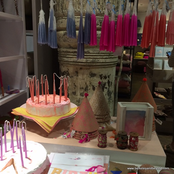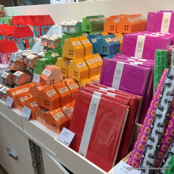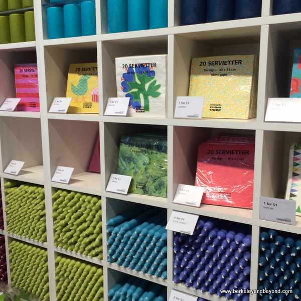 The merchandise is arranged along a zig-zag path through the store, sort of like at Ikea, so you get a chance to eyeball everything. I wound up buying several packages of colorful dinner napkins for $1 (I love the ones with little clouds on a sky-blue background), and my daughter bought me a really cute birthday card.