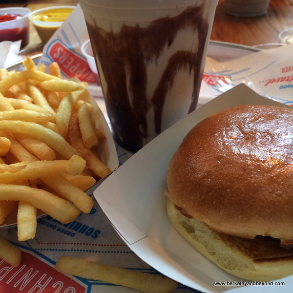 Burgers are the menu mainstay. I ordered the basic but made the mistake of calling it “plain” and so got no toppings. This was quickly remedied by a roaming server, who delivered lettuce, tomato, onion, and pickles to me with a big smile. Also on the basically American-food menu are fried chicken, sandwiches (including a BLAT--bacon, lettuce, avocado, tomato), hot dogs, mac and cheese, sloppy joe, fish & chips, and salads as well as very good chicken tacos. Sides include as assortment of fries—the sweet potato fries with the maple syrup dip is very popular--as well as thick onion rings. Complimentary chilled lemon-water is available, but I opted for a delicious black & white shake consisting of vanilla ice cream swirled with chocolate sauce.
