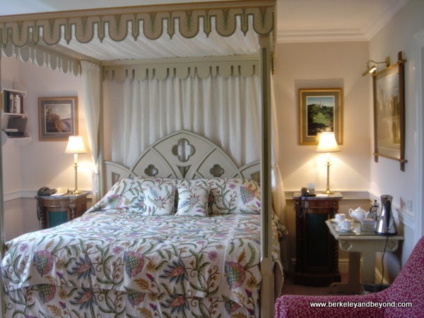 Guest rooms are decorated uniquely in a contemporary chic style consisting of coordinated fabrics in patterns and solids. To encourage guests to relax and unwind, rooms do not have a clock, but they do have a tea tray equipped with a china tea service bearing the Duke’s crest in gold, a delightfully fast hot water kettle, and a selection of hot chocolate, tea, and powdered coffee—plus shortbread and fruit for a snack. Further English-style comfort is provided in the form of a hot water bottle, and all rooms have a bathtub. The Lismore Suite (named for a castle in Cork, Ireland), where I stayed, has a large deep tub with a metallic tangle of hardware that includes a hand-held shower and an “airbath” feature that sends Jacuzzi-style bubbles out through circles of holes in the tub’s bottom. This suite also has a large shower, a canopy bed with an exquisite multicolor crewel-embroidered floral bedspread, doors that are arched like church windows, and framed photos of its Irish castle namesake. A superb “hills and dales view” of the surrounding estate extends seemingly forever and is visible from most rooms.