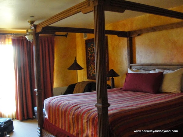 Breakfast features both extraordinarily delicious chocolate croissants and regular croissants from a talented local baker along with orange juice, coffee, and tea. Should you stay two nights and be here at noon, a nacho bar with salsas as well as Mexican beer and coke is provided. Each guest room is also stocked with a complimentary welcome snack basket filled with sodas, waters, chips, and more. No one goes hungry at the La Fonda! Books, board games, and movies are available to borrow, as are coolers, boogie boards, towels, and chairs for the beach. A coupon for free wine tasting is also usually available. Guests have complimentary use of the Avila Bay Athletic Club, located about 2 miles away, and guests who are celebrating a birthday get a special cake and those who are celebrating an anniversary get Champagne. The entire hotel is nicely decorated with Mexican items, including a large collection of hand-painted Talavera ceramics from the Jalisco area of Mexico and terra cotta-colored Mexican paver-tile floors. Hand-painted art works are here and there on the walls sponge-painted in lovely warm colors. Guest rooms are all large, and most have a balcony and a two-person shower with six heads. All rooms have a two-person Jacuzzi tub, a high undraped canopy bed, and heavy Mexican furniture
