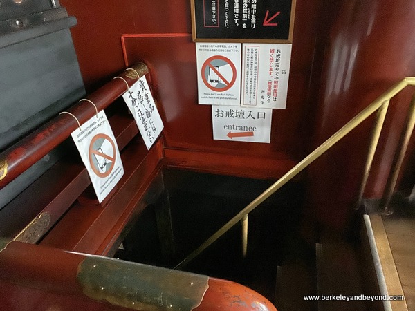 Rebuilt most recently in 1707, the Zenkoji temple building is one of Japan’s largest wooden temples. Its ornate main hall displays an assortment of Buddhist statues. As you enter the main temple building, look out for Obinzuru-sama, a seated wooden monk statue that has been worn smooth over the years from visitors rubbing the part of it that ails them in their own body with the hope of absorbing its healing properties. A fee (500 yen, includes history museum) is charged to enter the hall's inner chamber to get a closer look at the temple's main altar. It includes entering an underground passage beneath the inner chamber that visitors walk through in complete darkness in search of the "key to paradise." Visitors run their hand along the wall on their right so they can caress the key that is believed to grant salvation to anyone who touches it. Walking the pitch black passage symbolizes that all people are created equal, and that as they pass through darkness into light they are reborn, become pure, and start a new life.