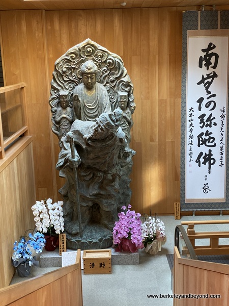 To the left of the main gate is a temple with white lanterns called the Daihongan, which houses the residence of the female Buddhist high priestess and also a nunnery. A Buddha that was once thrown into a pond now sits at the bottom of the steps.