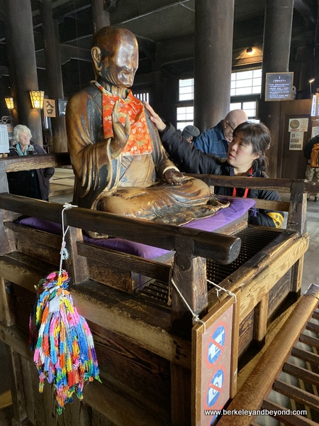 The courtyard inside houses one large and six medium-size red-hatted statues of Jizo Bodhisattva. They are believed to protect visitors from hungry ghosts and lead them to the six walls to heaven. The courtyard also holds an enormous lion-capped cauldron that emits healing incense, which visitors waft towards parts of their bodies that need healing.