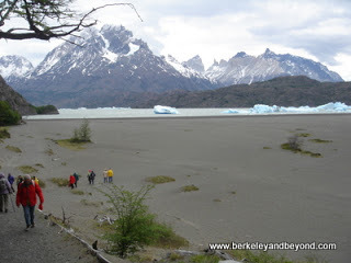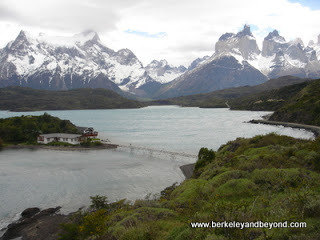 TORRES DEL PAINE NATIONAL PARK (pronounced TOR-ehs del PIE-nay; “paine” is an Indian word for “blue”) After several hours of traveling in a van over bumpy dirt roads and through green pastures filled with fat sheep and baby lambs, we got our exciting first glimpse of the iconic jagged peaks we traveled half way around the world to see--the three sheer granite peaks forming the Paine Massif, the very symbol of Patagonia. Established in 1959 by the Chilean government, this massive 450,000-acre park is a UNESCO Biosphere Reserve and also a hiker's paradise. An extensive collection of groomed trails range from an easy walk around a lake to a challenging 7-hour trek to Glacier Grey (though you can see this massive glacier and lake up close with a much shorter hike, too). You’ll also most likely see—as I did--herds of docile, camel-like guanacos (they are related to the llama, but with shorter hair) and flocks of Andean condors. Armadillos, black-throated swans, pink flamingos, and the Andean puma are also sometimes spotted. Interestingly, the park has no poisonous plants or reptiles. The area is famous for strong winds that sometimes knock people over. Hear the whipping winds in this video taken at milky turquoise-colored Lago Nordenskjold.