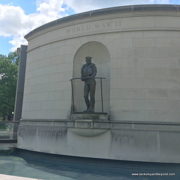 #5The West Virginia Veteran’s Memorial is a two-story oval monument honoring more than 10,000 West Virginians who made the ultimate sacrifice in defending the nation in twentieth-century conflicts. Composed of four limestone monoliths surrounded by a reflecting pool, the interior walls are faced in polished black granite etched with the names of these men and women. The Memorial was designed by P. Joseph Mullins, who also sculpted the four figures representing the four major twentieth-century conflicts and the four major branches of military service. The statue in the photo depicts a sailor from World War II.