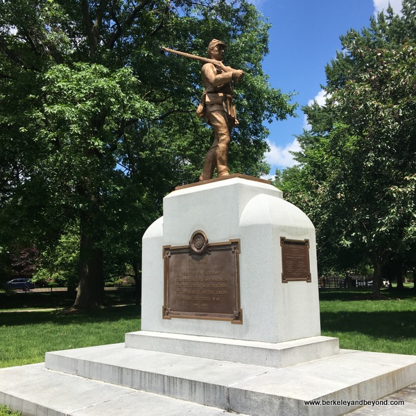 #3On the west end not far from Stonewall Jackson stands the statue commemorating 32,000 soldiers, sailors, and marines from West Virginia who fought for the Union cause in the Civil War. Some years ago when the bronze statue was repaired, it was coated with a plastic substance which gives it its orange look. The strange hue was very upsetting to the locals who were used to the seeing their statues in greenish bronze.