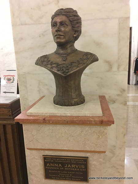#8This bust of Anna Jarvis stands next to the information desk on the main floor of the West Virginia State Capitol. Jarvis grew up in Grafton, West Virginia, and is credited as the founder of Mother’s Day in the United States. After the death of her mother, she organized an aggressive campaign to establish a National Mother’s Day, and thanks to her efforts, by 1911 almost every state in the nation was celebrating Mother’s Day.