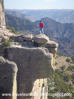 Divisadero Lookout Point In Arepo. This point offers a spectacular view of Copper Canyon that includes Piedra Volada—a mound that projects out over the canyon with an enormous round rock on top that visitors like to climb on and dangerously rock from side to side. Many Tarahumara Indians sell their handmade crafts and souvenirs here.