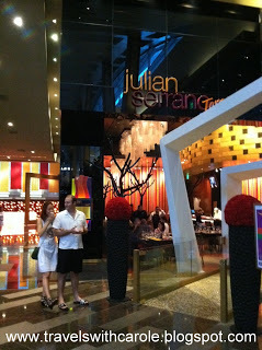 ●Julian Serrano Casino level. Celebrity chef Julian Serrano prepares creative tapas, tasty housemade sangrias, and posh seafoods. Plan to share. Best of the bunch includes lobster salad, stuffed piquillo peppers, brava potatoes, and gambas (prawns sautéed in olive oil). If room permits, also try albondigas (pork-beef meatballs in a light tomato sauce) and grilled Angus flat-iron steak. For dessert, there is always room for molten chocolate cake with blood orange sherbet.