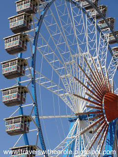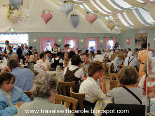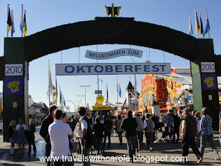 Probably the best thing for out-of-towners to do is to purchase an Oktoberfest package. Viator offers one that includes a tour of the grounds, a ride on the creaky Ferris wheel (on a clear day you can see the Alps), and a reserved seat in a tent with beer and food. Seating on my tour in 2010 was reserved from noon until around 5 p.m. and included two litres of beer and half of a roasted chicken per person (drink and food is a mandatory purchase with tickets to the tents). Iain, our English guide, whose Mick Jagger-blue eyes almost exactly matched his blue-and-white shirt, said he had been attending Oktoberfest for 10 years and informed us that "we've got serious beer drinking to do." We were cautioned to be sensible and not to become bierleichen, or "beer corpses"—a term that refers to passed out drinkers, NOT dead drinkers. As our group got ready to board the Ferris wheel, he told us that the weather that day was "fur"--or was it "farn"?—when a warm wind comes over the Alps and everyone gets headaches and aggressive and drunk. He said that on this kind of day you "can see for crazy miles." We learned that 70% of people attending are from Bavaria (50% from Munich, 20% from the rest of Germany, and 10% from the rest of the world--with Italians and Australians making up the largest portion). In 2010, 6.2 million-plus people attended. Iain refers to this--the biggest festival on Earth—as "the beast". While we caught our breath, he filled us in on the history. Oktoberfest started long ago, when people figured out that the best way to get rid of an excess of beer was to have a festival. Tents began appearing in 1881. Albert Einstein installed light bulbs in the 1800s in the Schot tent. "Now people pour in through the gates like beer into a stein. It's mad, absolutely mad. Good times," he declared, and then pointed out that Germany was created as a country only in 1871, that it is a baby compared to the U.S.—the same age as Lucky Strike cigarettes! Before we enter our tent, he tells us that amazingly everything is removed from the fairgrounds after the last day. The area becomes an empty field with roads. One of my tour mates summed it all up as "like a state fair on steroids."