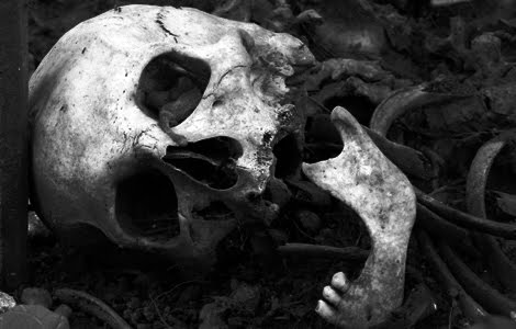 A caveira que o impressionou, desdentada e pintalgada de pretidão, retinha uma imperturbável atitude altiva — era um génio subterrâneo, que guardava a passagem com um sinal de sobranceria, de displicência. Teias de linho, miscigenadas com filigranas fungongóricas, amarravam-na à terra humedecida e, no seu interior, observável através das órbitas ocas, encontravam-se excedentes cefalóides: um forro feito de antigualhas, agora fossilformes.