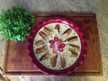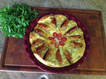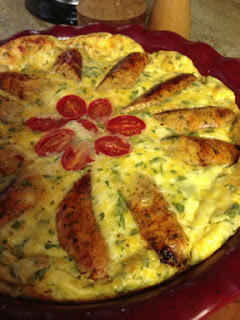 Meanwhile, sift the flour and salt into a mixing bowl, then stir in the cheese. In a small bowl, beat together the milk, eggs and parsley. Season with salt and pepper. Add half the mixture to the flour and cheese and stir until smooth. Let stand 5 minutes, and then stir in the remaining milk mixture. Arrange the links in a lightly sprayed 9-inch pie pan and pour the batter over them. Arrange the tomatoes, if using, or another garnish. Lower the oven heat to 400 degrees and bake until the batter is puffed up and brown. About 30 minutes. *I used Sabatino's Smoked Mozzarella with Artichokes and Garlic Chicken Sausages and Mexican-style shredded cheese.