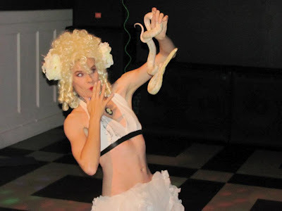 I also dance with my snakes in a solo act called "The Temptation of Eve." In this story, I am dressed in a coquette outfit while acting out the interaction between Eve and the snake in the Garden of Eden. Eve eats the apple right away and dances with the snake, at first shocked at the moves he evokes in her! They are all friends at the end, and Eve leaves with the snake, leaving Adam in the lurch.