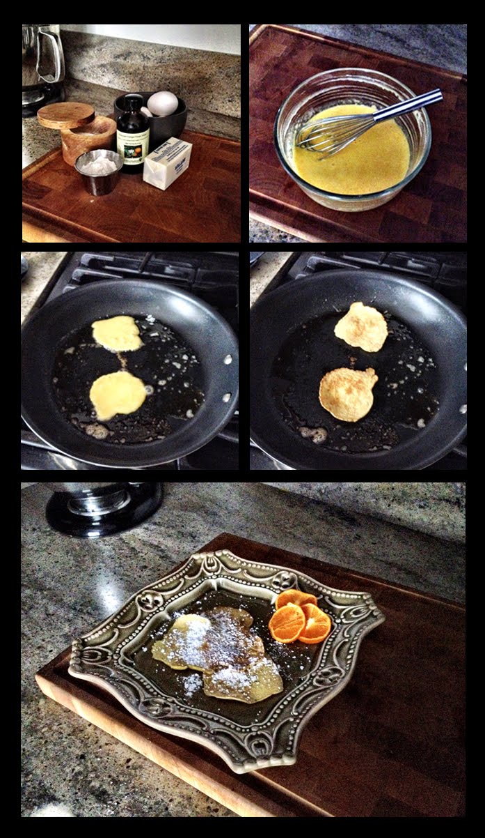 The recipe yielded 13 pancakes, and I can't say they resembled anything that I have come to expect of pancakes. I would describe them as thick, small crepes. Also, the amount of orange-flower water was not nearly enough to be detected. Still, the pancakes were good and they went quickly. I had a few with just the powdered sugar, sort of like a French Quarter beignet. And before my husband could even sample them, my picky-eater 3-year-old daughter smeared them with grape jelly and finished them off.