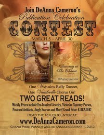 What do you do when you have two book releases in two months? Celebrate, of course! And I'm doing it by giving stuff away. Lots of stuff. Stuff that the Victorian belly dancers in THE BELLY DANCER would love, and stuff that the vaudeville dancers in DANCING AT THE CHANCE would crave. There's also a grand prize that anyone would love: the winner's choice of a brand new Nook or Kindle.*Wanna find out how you can collect entries for the weekly prizes and the grand prize? Visit www.DeAnnaCameron.com and follow the Publication Celebration Contest link.