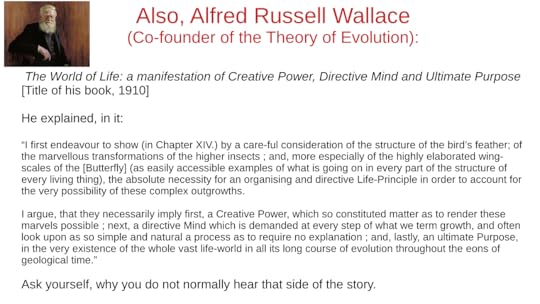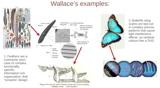 The answer is obviously yes (people have asked the question done the investigations and published findings . . . never mind utterly revealing, hyperskeptical denials of such publications), and the results highlight that the fine tuning of the cosmos and the functionally specific, complex organisation and associated information in the world of life are strong signs of such intelligent design. For example, here is Wallace: