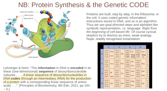 Oddly, the world of life has NOT led designers to instantly infer to God designed life. As was pointed out by Thaxton et al in the 1980’s, design of cell based life does not in itself imply designer beyond or within the cosmos. That is an onward question.