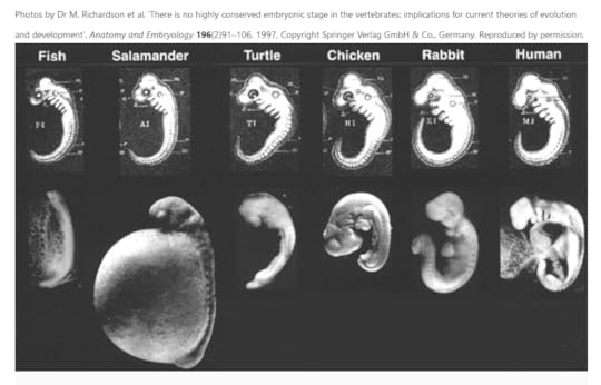 It is in this context that we should evaluate his similarly artfully distorted comparative illustrations of embryos, intended to support the phrase — he seems to have coined it — ontogeny recapitulates phylogeny . . . the development from zygote retraces evolutionary, body plan level ancestry. (Often, in textbooks up to the turn of the 2,000’s, much was made of what superficially looks like gill filaments.)