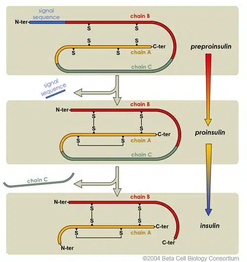 The end-product insulin protein is put together from the preproinsulin produced stepwise in the ribosome, by way of a clever alignment that uses a third, “scaffolding,” chain C sequence: