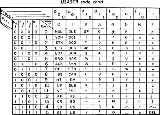 U/D Sept 6: Let us compare the ASCII code, which uses seven element strings b7 . . . b1, with two states per character bx [bases have four states per character, so Codons have 64 states], showing how a commonplace communication code is structured . . . directly comparable: