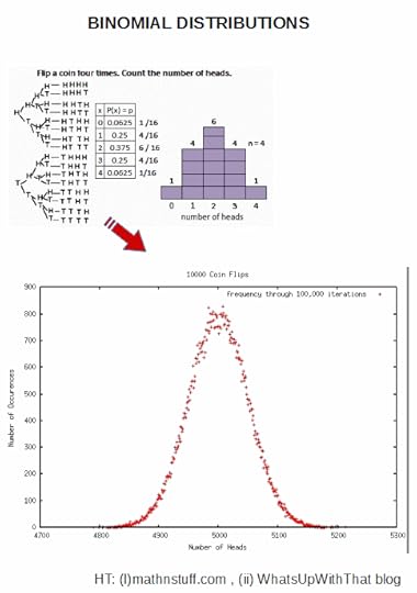 We see the binomial distribution of coin-flipping possibilities, here based on 10,000 actual tosses iterated 100,000 times, also indicating just how tight the peak is, mostly being between 4,850 and 5,150 H: