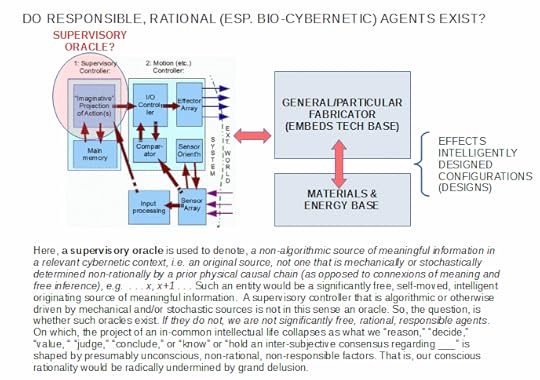Immediately, this shows the fundamental error in the notion that on evidence of signs of design we are only warranted to infer to human or human-like embodied designers. For, the rational roots of design point to our being mind over matter amphibians, bio-cybernetic entities with supervisory oracles that simply don’t work in the way dynamic-stochastic computational substrates do.