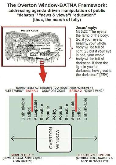 Here, we see an illustration of how power balances and support for policy can move across time. Where, proverbially, elections are won in the middle, through the swinging vote (and sometimes through disaffection of supporters who do not support one who would naturally be their candidate save for some issue or scandal X). In that context there are two BATNA points, where a critical mass will reject a proposal beyond that threshold, swinging the balance of voters or policy makers decisively against the relevant perceived radical faction.