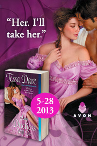 If you want to chat about this book, there are several chances! There will be a Twitter chat today (May 28th, 4pm ET/1pm PT), hashtag #dukeproblems; my GoodReads group has an ongoing discussion thread; and there will be a special “Ask Tessa Dare” event at GoodReads on June 10th. I’ll be in the Chicago and Ohio areas in the next few weeks – details here. And of course, please feel free to just email me, too!