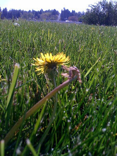 The smell of fertilizer taints the air of my front yard, and where I hate the smell, I love that it will kill the hundred-plus dandelion's that have flourished there. It's always too cold to fertilize before the grass begins to grow, so every year we end up with this less than beautiful bed of yellow flowers - definitely not the romatic bed of flowers I was hoping for.