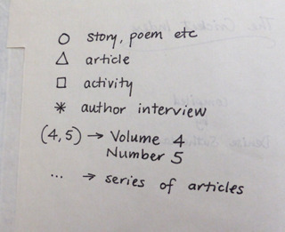 I used symbols to indicate whether an entry was an article, recipe, activity etc. The numbers are (volume, issue) - no page number included.