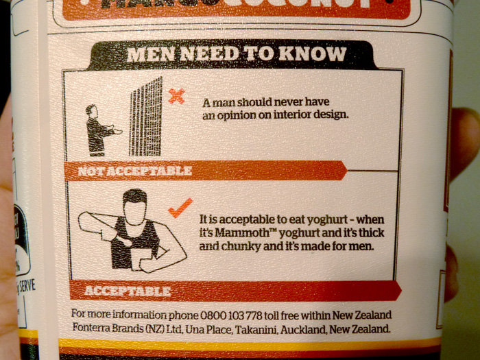 My friend Jane and I were sharing an apartment room, and were amused by this local yoghurt we bought for breakfast : Mammoth Yoghurt for men. It was heartily delicious, but I was a bit alarmed that after eating it, I suddenly became very interested in all the nice men's fashion and shoe shops around Wellington, and had a hankering for aftershave. It must have been a bit too strong for me!