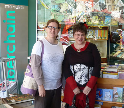 My second technical editor, Deborah Green came from interstate for the event, and stayed with us overnight. We all got dolled up — the crossword corset had its first outing — and headed for Manuka, with a car full of nommy goodies!