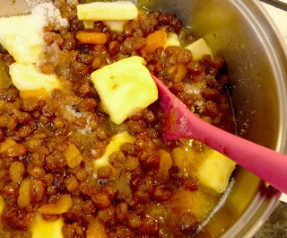 1. Put the sultanas and peel (or chopped dried apricots, or currants, or whatever) into a large saucepan. Pour in enough water to cover the fruit. Bring to the boil, then simmer until all the liquid is absorbed, stirring occasionally. Remove from the heat.