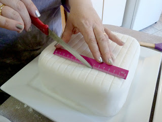 2. Using the back of a knife, or a very clean ruler edge, lightly press a regular grid design into the top of the cake. You don't want the lines to press down too far into the icing. You can also photocopy a crossword (enlarged) and use that as a guide, running a blunt edge over the lines, to lightly mark the icing surface.