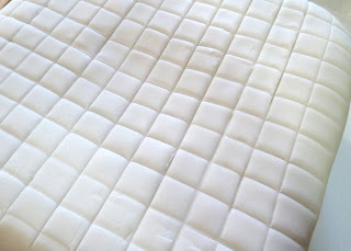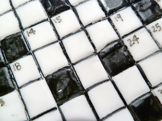 The square cake in progress5. Colour in the squares that should be black, using your printed-out crossword as a guide. You can use kitchen paper or cotton buds dipped in clean water to carefully wipe away any mistakes. Work slowly and carefully! This part takes quite a while, I did it over several days. Good to do while watching NCIS.6. Leave to dry overnight.