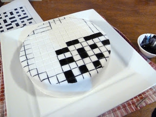 I got the basic idea and method for how to do this from the Cake or death? website (see the cryptic crossword cake close up, and Janet's decoration technique). This is her cryptic crossword cake, which I love. Looks, an icing pencil! She's gone as far as adding custom cryptic clues, a step I haven't done (this time!) ... the by Araucakia line is hilarious (a take on Araucaria, a famous UK cryptic setter). I also highly approve of her Eddie Izzard Cake or death? connection!