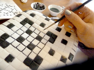 The round cake just started4. Paint in the indented lines (or use the pen, but I found the brush worked better), to draw the grid. Avoid leaning your hand on the cake, if you can help it (I didn't manage this well, though, LOL!). Rest your elbow on the bench, and hold the wrist of your painting hand with your other hand.